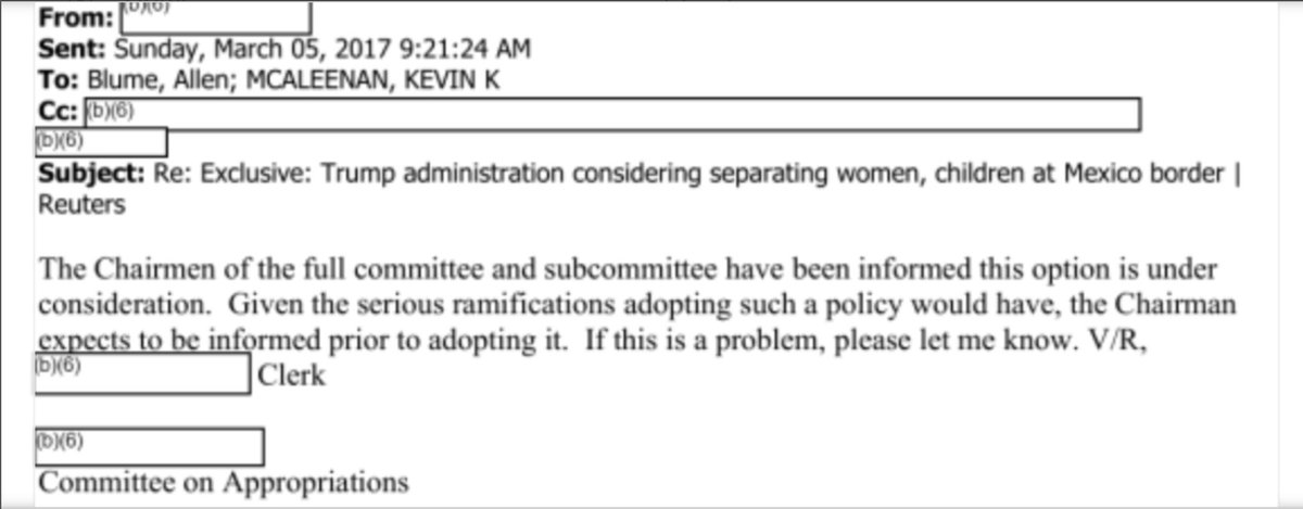 On March 5, an Appropriations Committee staffer emailed then-CBP Commissioner McAleenan that the committee wanted to be informed before the policy is adopted. McAleenan forwarded the exchange to then-DHS Chief of Staff Nielsen, who asked, “[W]hat is inside story?”