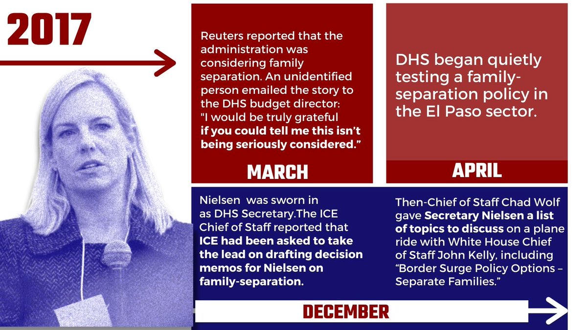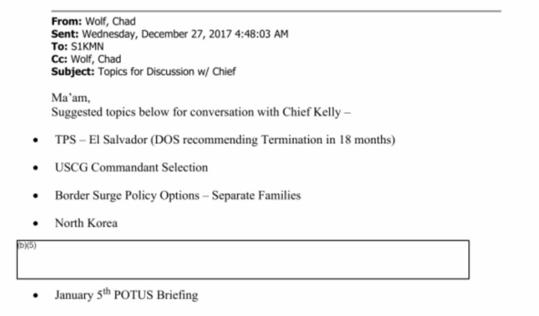 On December 27, 2017, then-Chief of Staff Chad Wolf gave Nielsen a list of topics to discuss on a plane ride with White House Chief of Staff John Kelly, including “Border Surge Policy Options – Separate Families.”