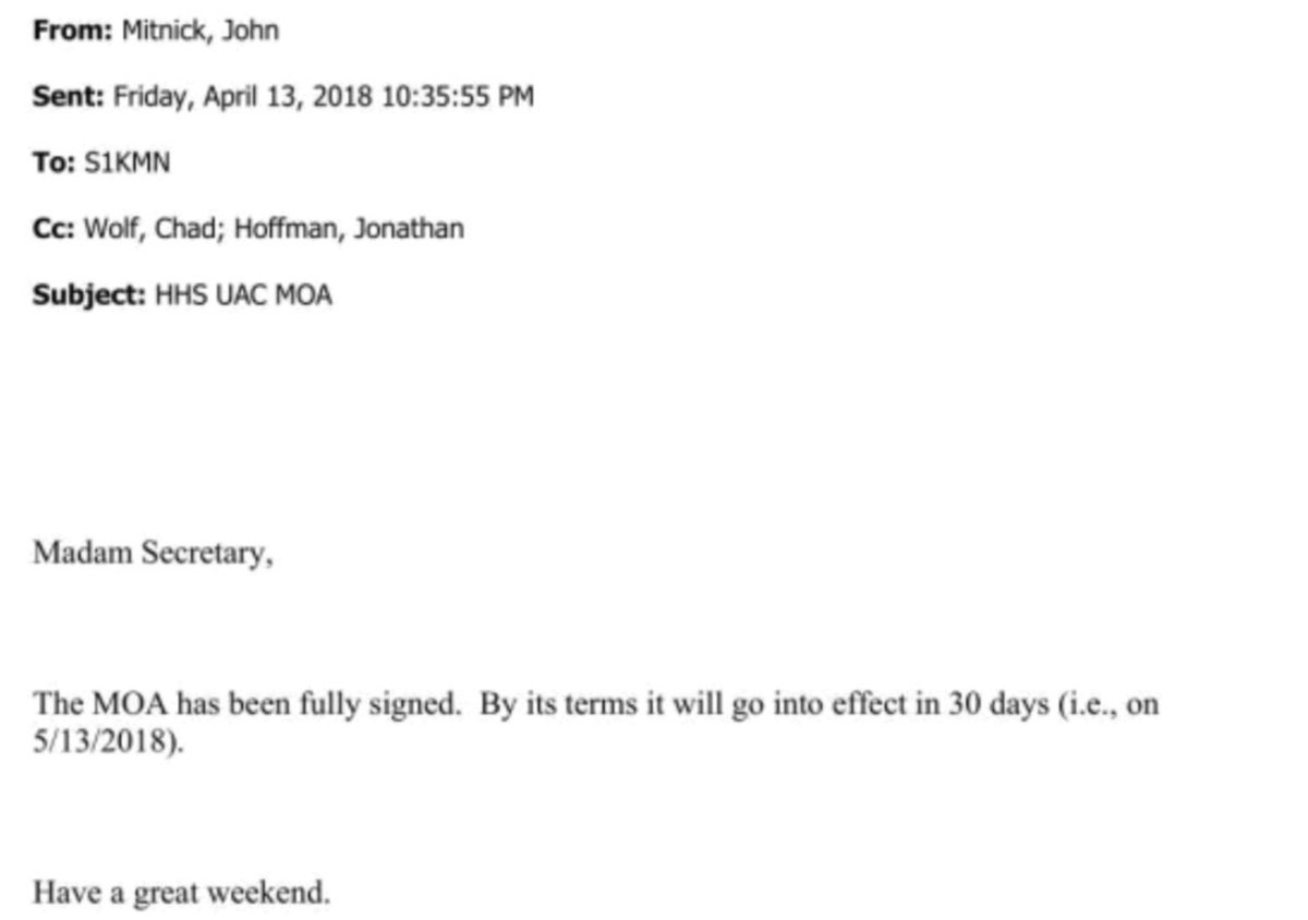 In April 2018, ICE General Counsel John Mitnick emailed Nielsen, Wolf, and others informing them that the HHS-DHS memorandum of agreement was signed. The MOA was about the Unaccompanied Alien Children program.