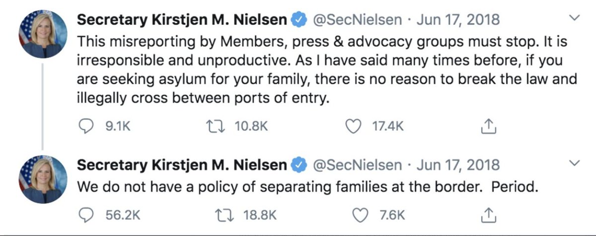 In June, CNN reported that DHS had separated 2,000 children from their parents at the southern border. That same month, Nielsen claimed on Twitter: “We do not have a policy of separating families at the border. Period.”