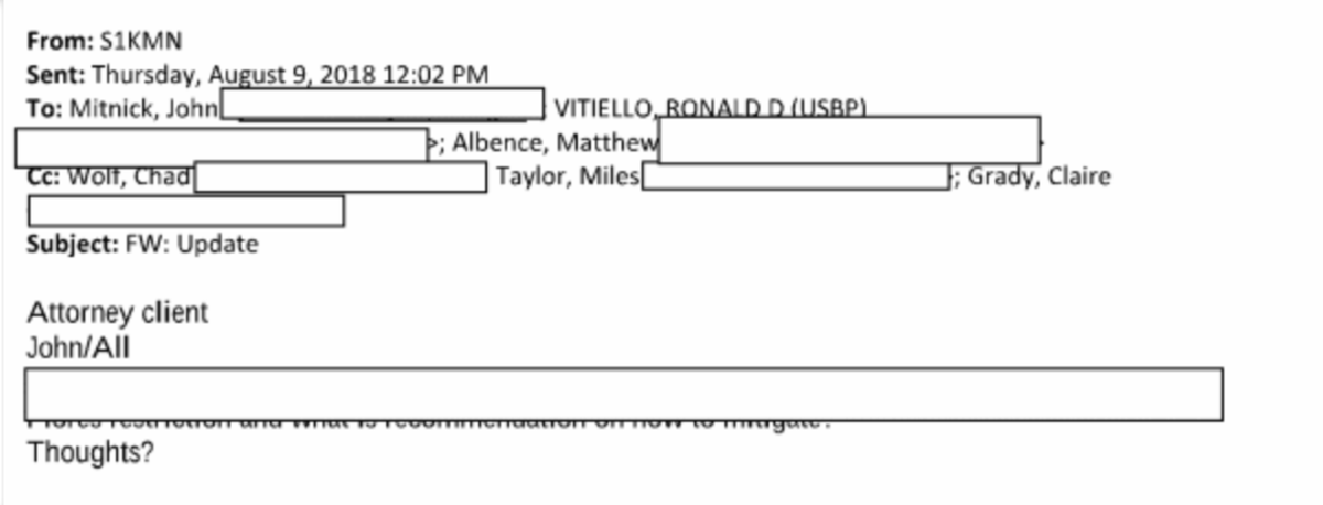In August 2018, Nielsen forwarded an exchange with Kelly, Deputy AG Rod Rosenstein & others to top DHS officials. She appears to ask for their thoughts on “what is recommendation on how to mitigate.”