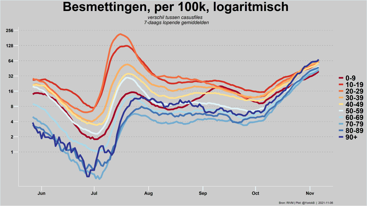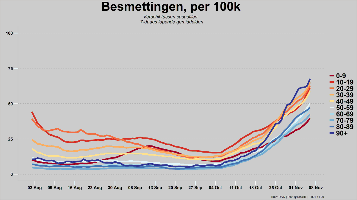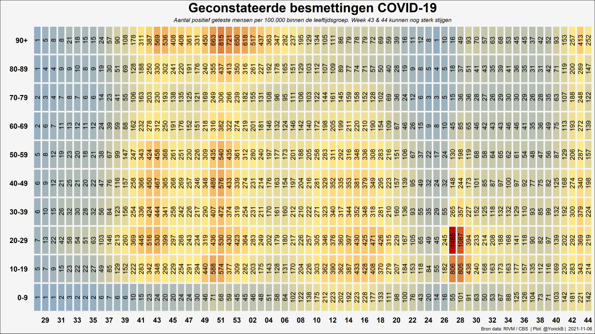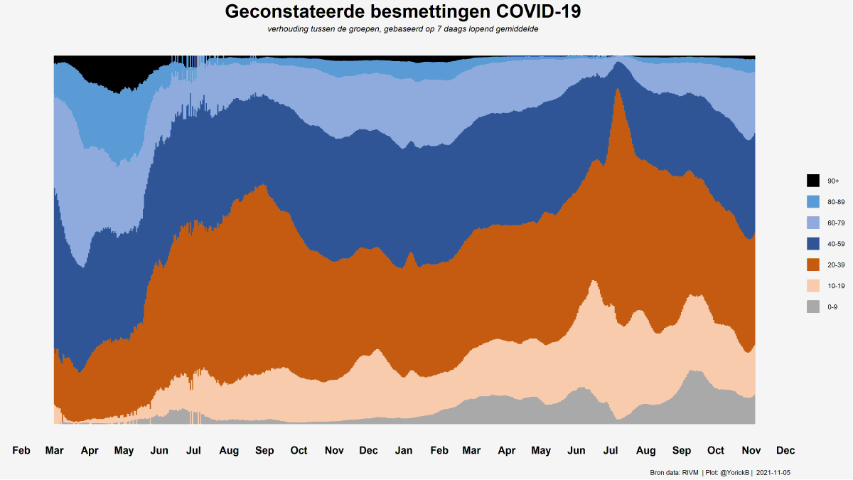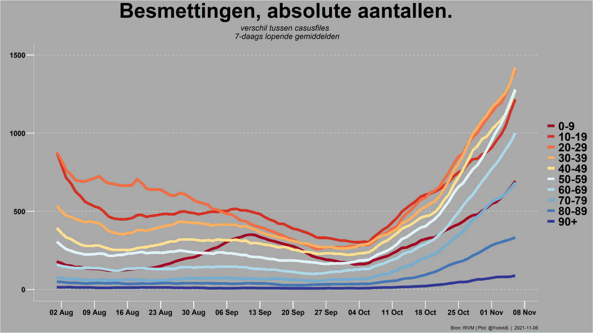 Aantal besmettingen binnen de leeftijdsgroepen.