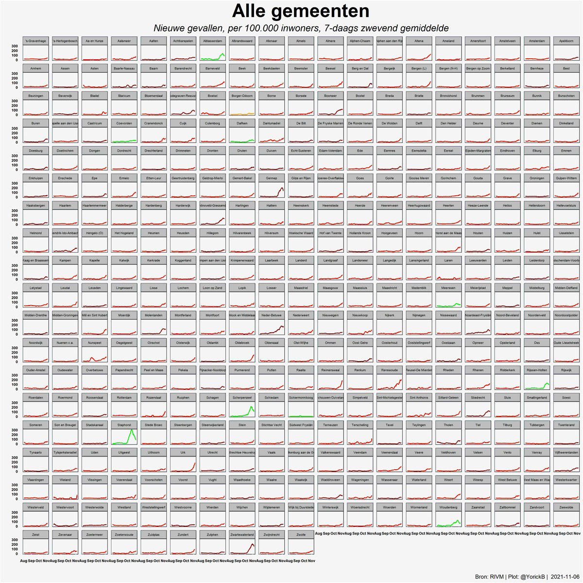 Maar als ik mijn (oude) indeling gebruik en ga kijken naar de verschillen tussen gemeentes met lage, middel, en hoge vaccinatiegraad; dan zie je dat die verschillen, die er waren(!), nu bijna zijn verdwenen.