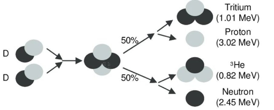 Dans le cas de la fusion D-3He, en théorie il n’y a pas de neutron. En théorie ? Oui car on peut avoir des réaction D-D qui elles forment du tritium. Et la réaction D-T est bien plus facile, donc tout le tritium produit réagit, et on forme quelques neutrons.