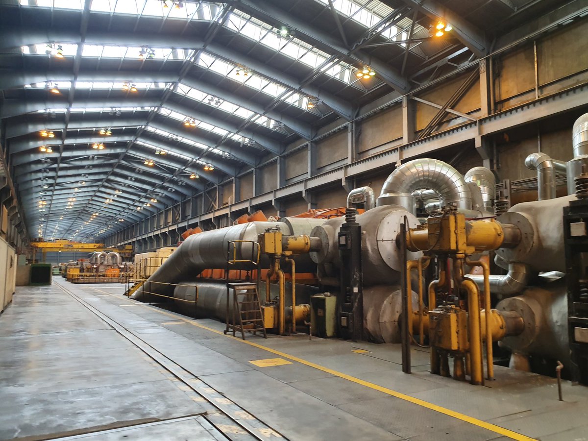 The steam turns a turbine at 3,000 rpm. That powers a generator that produces electricity