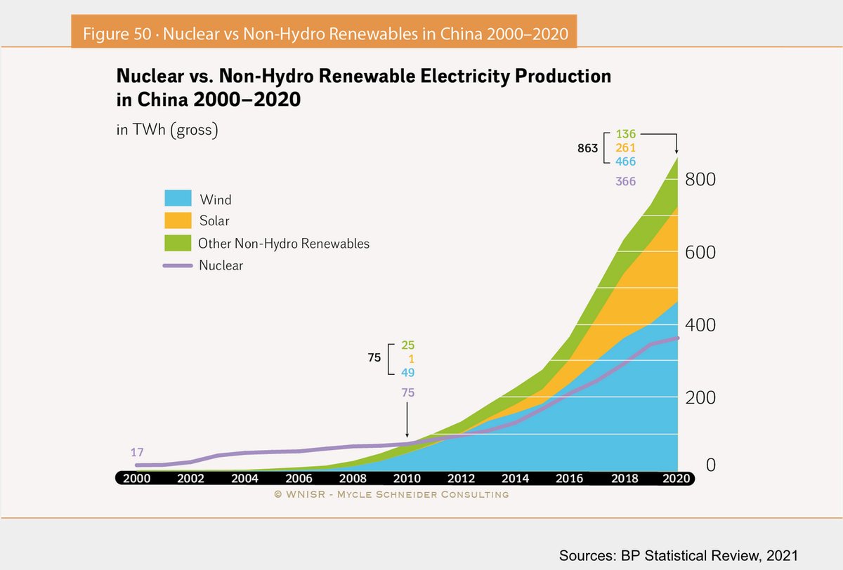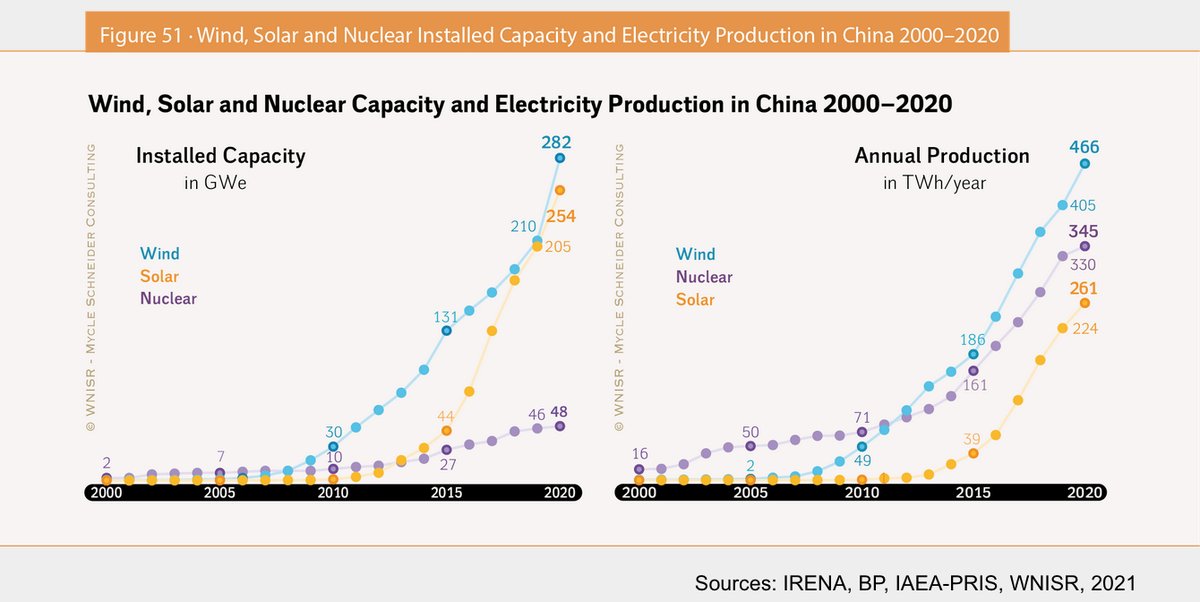 6/7 - La réalité c'est surtout une dynamique de développement de plus en plus à l'encontre de ces désirs, comme l'illustrent là encore les évolutions en Chine, résumées par ces figures du chapitre "renouvelables / nucléaire" du dernier @nuclearreport worldnuclearreport.org/The-World-Nucl…