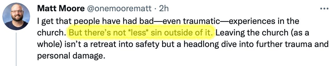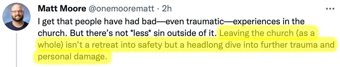 Note Matt isn't describing structural, cultural, or ideological issues in Christian Fundamentalism that exvangelicals have shed light on; the underlying systems of abuse and control that *produce* trauma. He's talking about "bad experiences that happened to occur in a church."