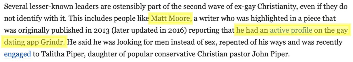 Now, the jab at "progressive, LGBT-affirming" churches is par for the course in fundamentalist discourse. But it's pointed in Moore's case; since being outed in 2013 when his Grindr profile was found, he's held the line on Gay Is Bad And He Doesn't Gay Anymore.
