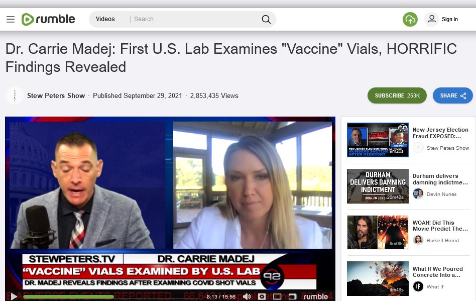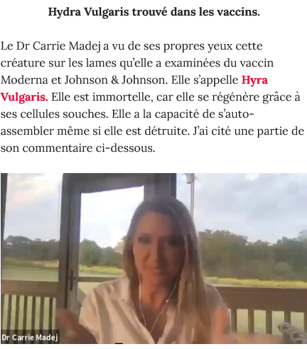 18/ Alors finalement, où Astrid Stuckelberger a-t-elle tiré ce bullshit d’hydre dans les vaccins ? Eh bien probablement chez Carrie Madej par son interview dans le Stew Peter Show, éventuellement chez Qanon France. Et pas ailleurs, cette infox n’ayant pas fait le buzz en Europe.
