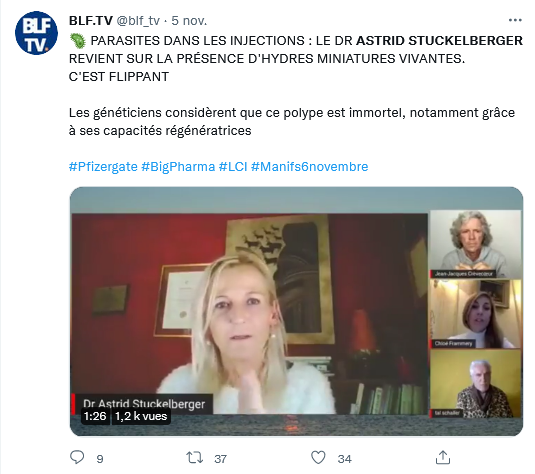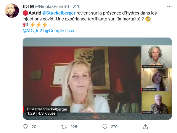 Donc. En fin de semaine dernière, Astrid Stuckelberger nous gratifiait d’un Nième délire dans « L’info en Questions » Les vaccins contiendraient des organismes vivants immortels, peut-être d’origine extraterrestres, des hydres, plus précisément. 1/n odysee.com/@FlowerPower:b…