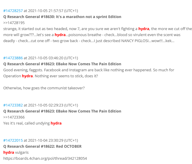 10/n : MAIS dès le 5 octobre, des posts font allusion à une «opération Hydra» en cours, liée à cette fameuse hydre. Si il y a eu opération coordonnée, elle n’aura porté que sur la diffusion de cette infox, l’original ayant été publié quelques jours plus tôt… Et pas de liens.