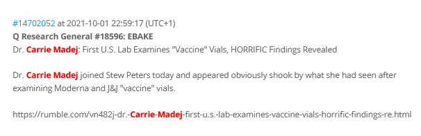 12/n : Puis, le 9 octobre, au Canada et en France, l’info émerge, traduite en Français par QAnon France, à partir de la vidéo Rumble, reprise par Bitchute, traduite par Jeanne montrant Carrie Madej faire son show... La boucle est bouclée, mais cela ne fait pas encore le buzz.