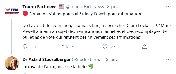 15/n : Mais elle est bien plus que ça. QAnon Doctor, tel est son surnom aux USA,… Une grosse pointure de la désinformation antivaxx, propagandiste QAnon et proche des cercles opérationnels de MAGA. (Make America Great Again, principal support de la campagne Trump)