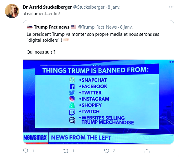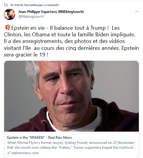 17/ Donc Carrie Madej, « idéologue antivaxx » est également une trumpiste acharnée. Comme Astrid Stuckelberger, Qui s’est faite régulièrement le relais des théories de l’ "Elite Strike Force" de Trump à propos du vol de l’élection, ou a souvent clamé son retour imminent.