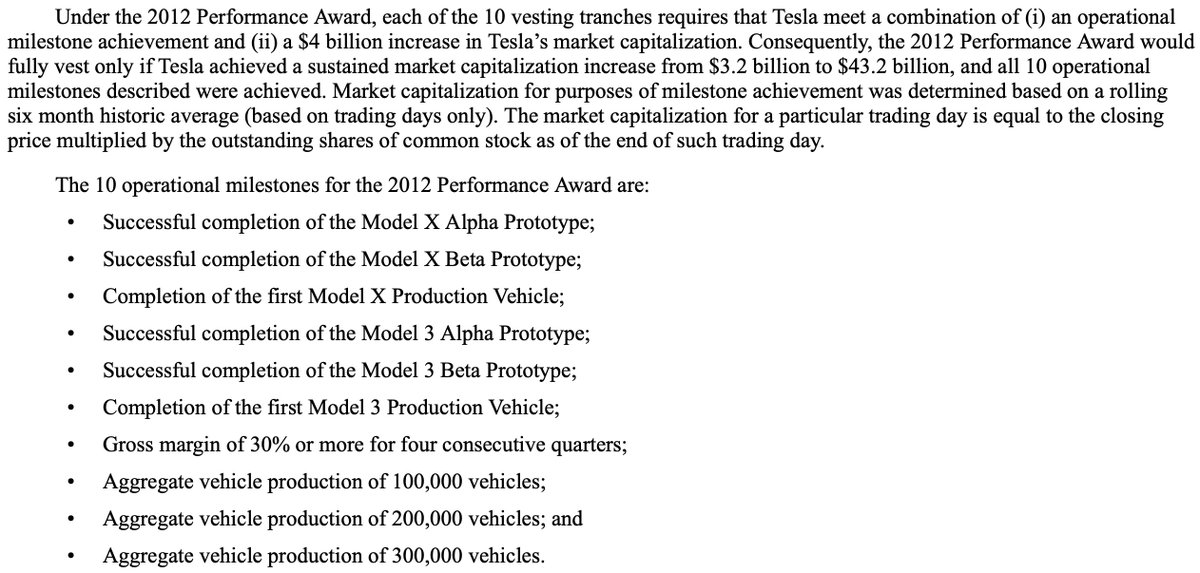 @elonmusk Prior to the 2018 CEO compensation plan, Elon agreed to a 2012 CEO compensation that would reward him in tranches for taking TSLA from $3.2B in market cap to $43.2B in market cap. Another 10x.