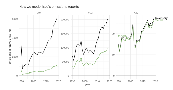 For Iraq, a war-torn country, there is one official estimate. Other datasets estimate annual emissions (using IEA, FAO, etc).