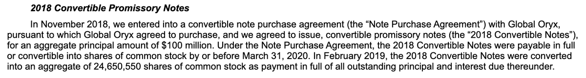 In November 2018, Global Oryx made its official first investment through a $100m convertible note. In February 2019 this converted into 24,650,550 of Series A preferred stock with an implied price of $4.06