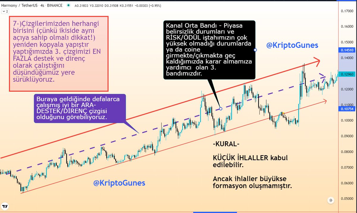 Fiyatın hareket ettiği koridoru yakaladıktan ve trend desteği ile trend direnç seviyelerini bulduktan sonra yardımcı çizgimiz olan kanal orta bandını da aynı mantıkla oluşturuyoruz. Bu bant bizim için çok kıymetli.