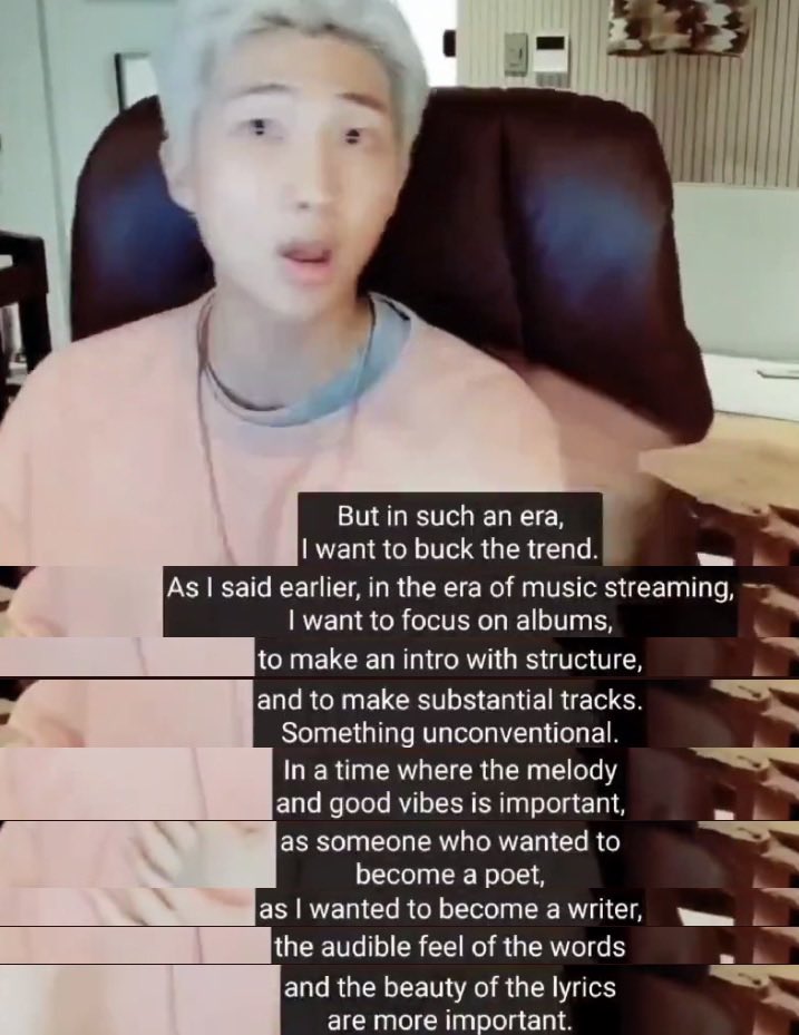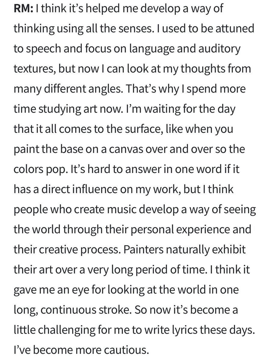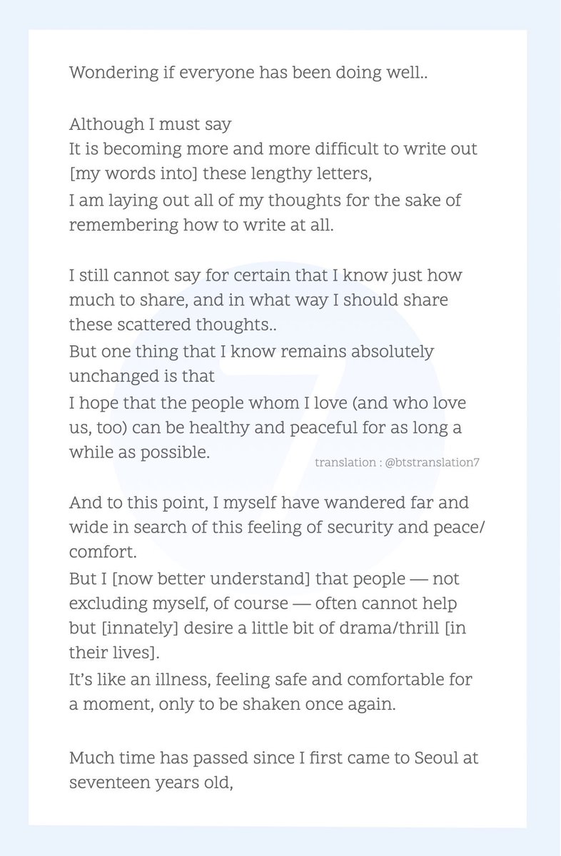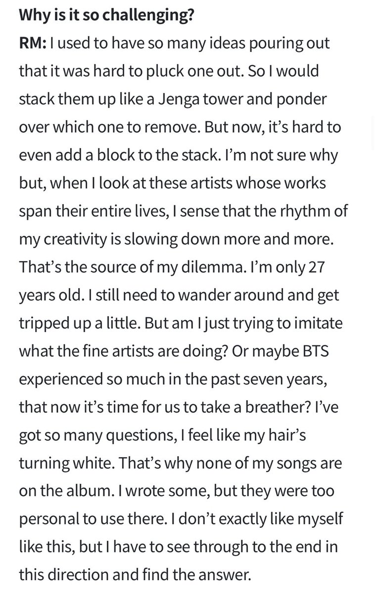 “But now…l sense that the rhythm of my creativity is slowing down more & more. That's the source of my dilemma. I'm only 27…I still need to wander around & get tripped up a little…Or maybe BTS experienced so much in the past 7yrs, that now it's time for us to take a breather?”
