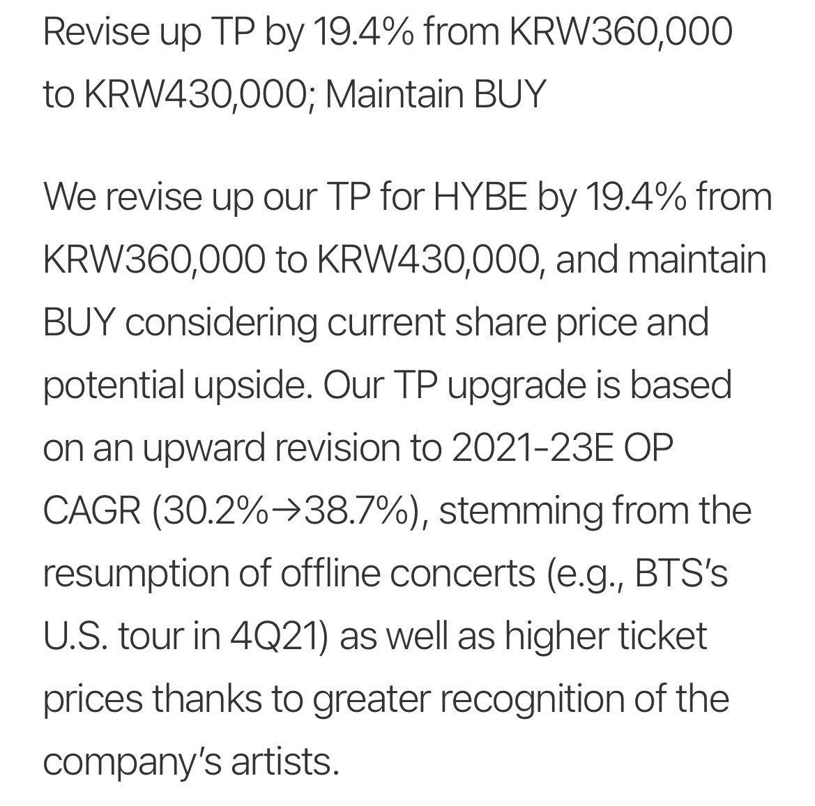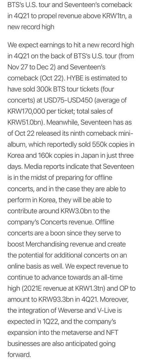 - outlook for 4Q21 is for BTS’ US tour and Seventeen’s comeback to propel revenue above ₩1 Trillion, a new record high