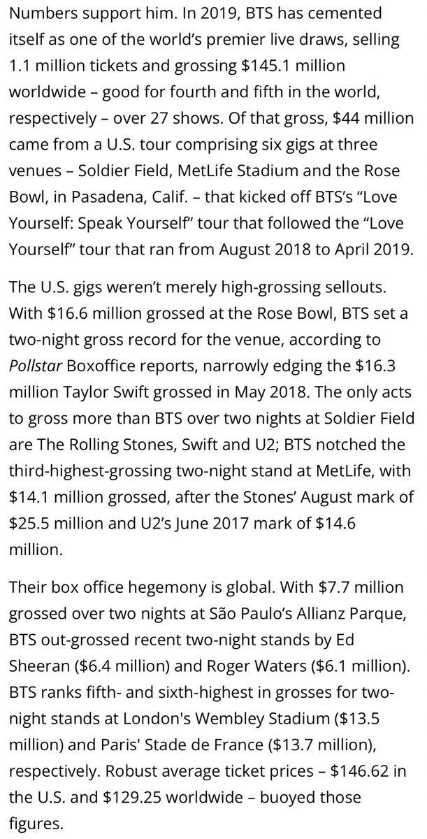 “Numbers support him. [By] 2019, BTS cemented itself as one of the world’s premier live draws…Their box office hegemony is global…