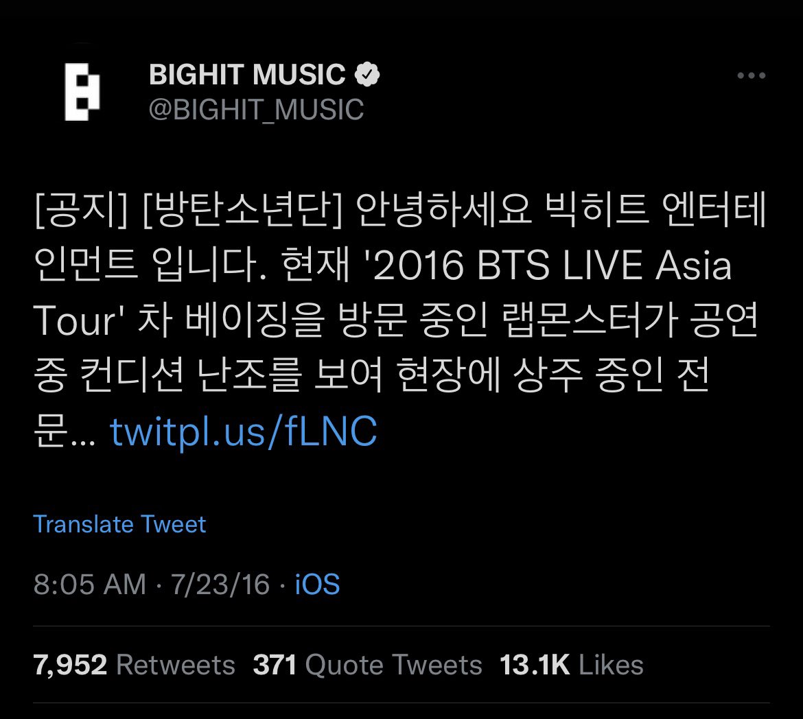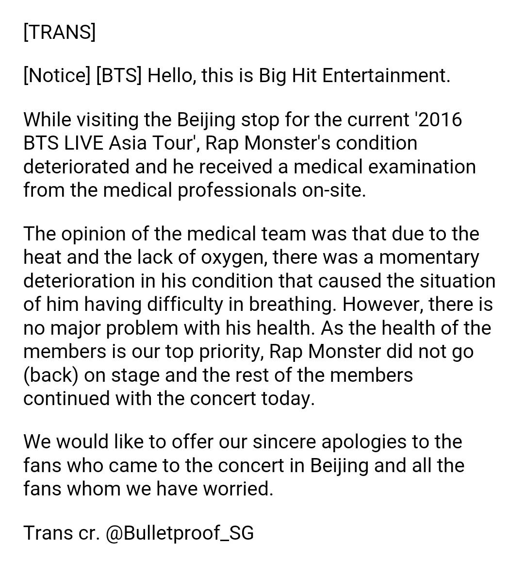 But it was just a couple months later, on July 23, 2016, at the Beijing stop of the HYYH Epilogue Tour, that Namjoon couldn’t finish a concert. BH released a statement, explaining he’d had difficulty breathing and received medical on site. They said it was due to the heat