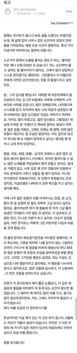 Namjoon Fancafe 20160510 ltr after May 7/8 start of The Most Beautiful Moment in Life On Stage: Epilogue tour