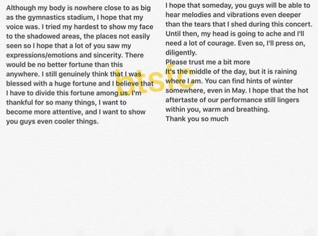 “I hope that someday, you’ll be able to hear melodies & vibrations even deeper than the tears I shed during this concert. Until then my head is going to ache & I'll need a lot of courage. Even so, I'll press on, diligently.