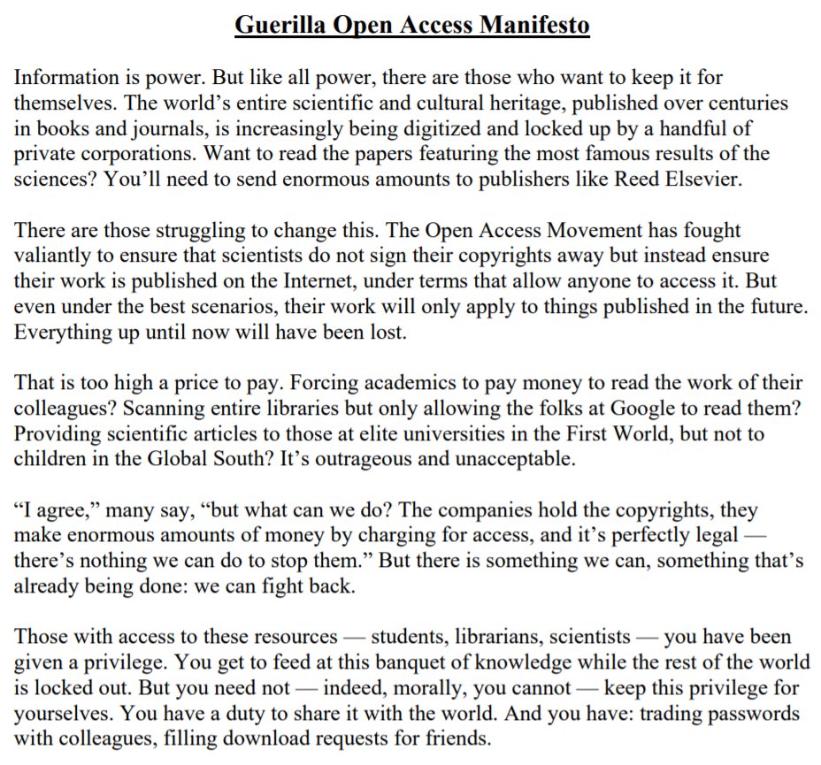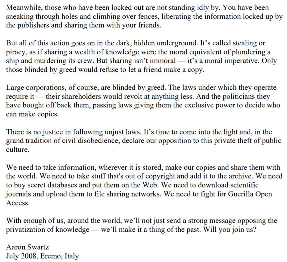 aaron swartz's guerilla open access manifesto: "There is no justice in following unjust laws. It's time to come into the light and, in the grand tradition of civil disobedience, declare our opposition to this private theft of public culture."