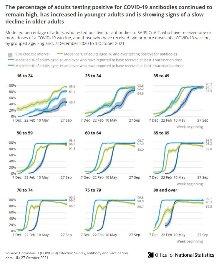 But of course Covid is not over - prevalence of infection is still high & immunity is waning in older age groups (as shown above) and many people in higher risk groups have not yet taken / are waiting for boosters but that is also picking up:
