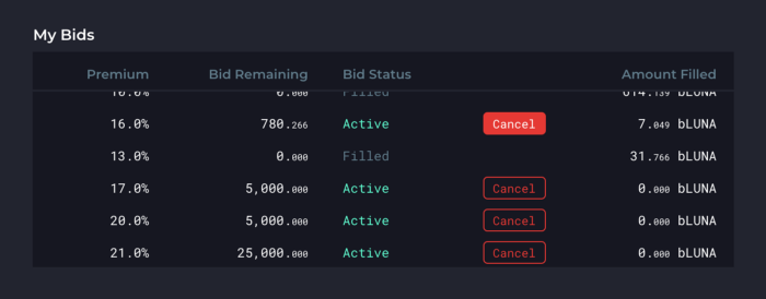 Si decide cancelar su oferta para volver a implementarla con una prima diferente (o pasar de bLUNA a BETH) desplácese hacia abajo hasta la tabla marcada "Mis ofertas" y haga clic en el botón rojo Cancelar junto a las ofertas que le gustaría cancelar.