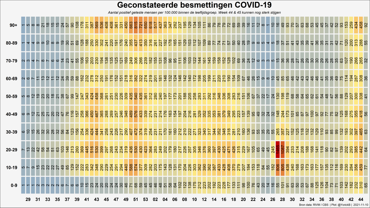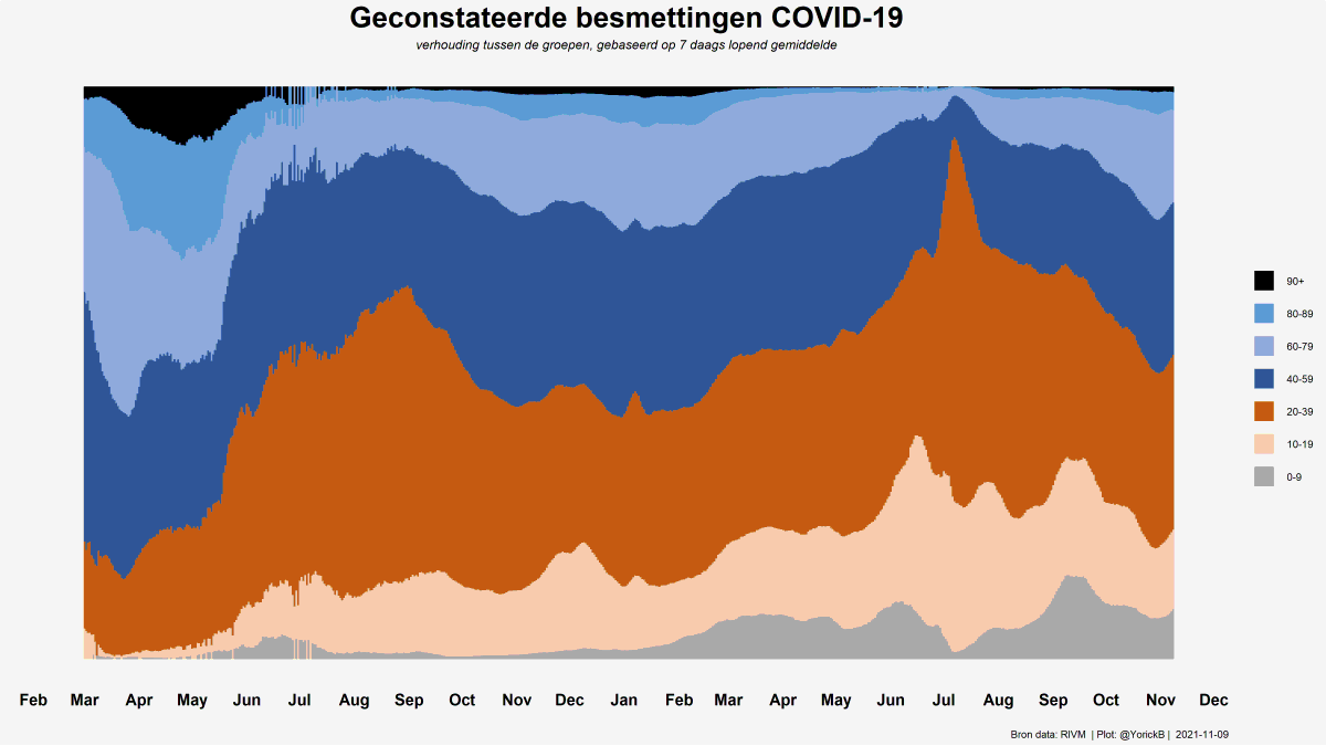 Aantal besmettingen binnen de leeftijdsgroepen.