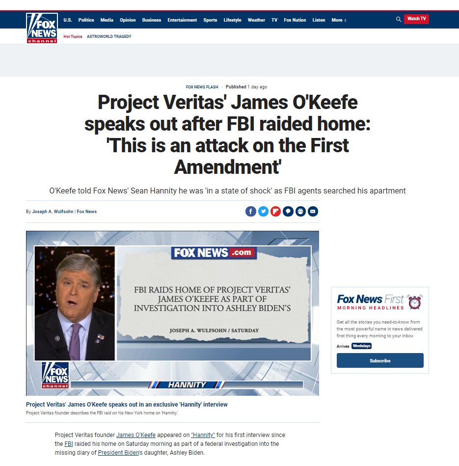 Fox News LOVE Project Veritas, with founder James O'Keefe appearing on "Hannity" for his first interview since the FBI raid.