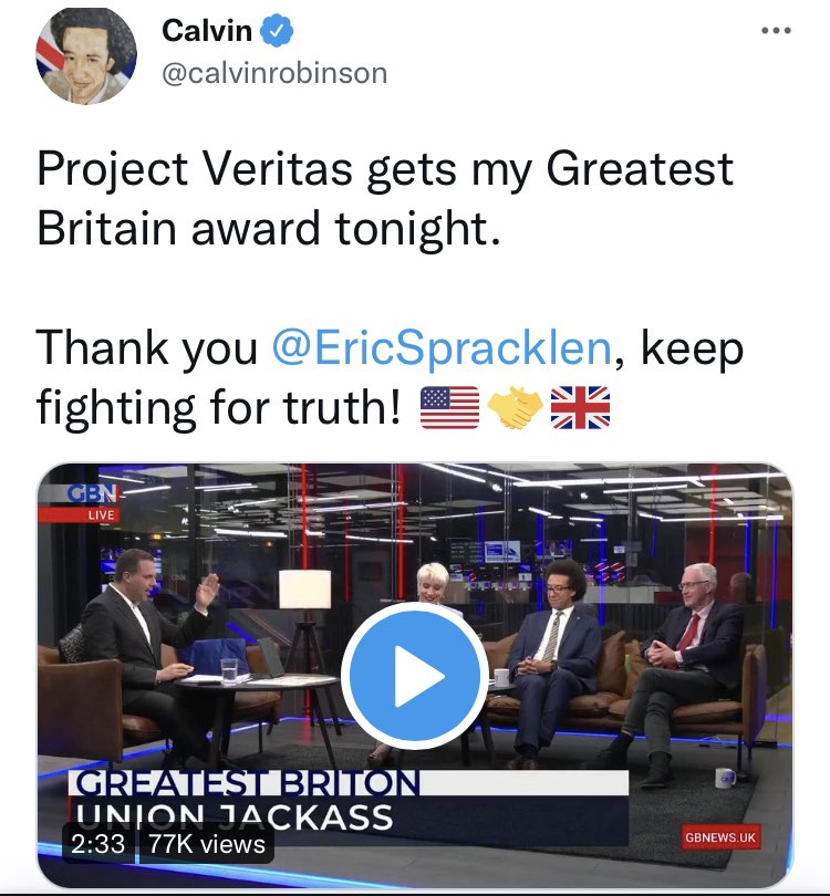 And as if by magic, up pops Britain's own Sean Hannity wannabe, Calvin Robinson, on Britain's very own Fox News, GB "News", to give American Eric Spracklen of Project Veritas a 'Greatest Britain' award for promoting a bullshit video about COVID.🤪