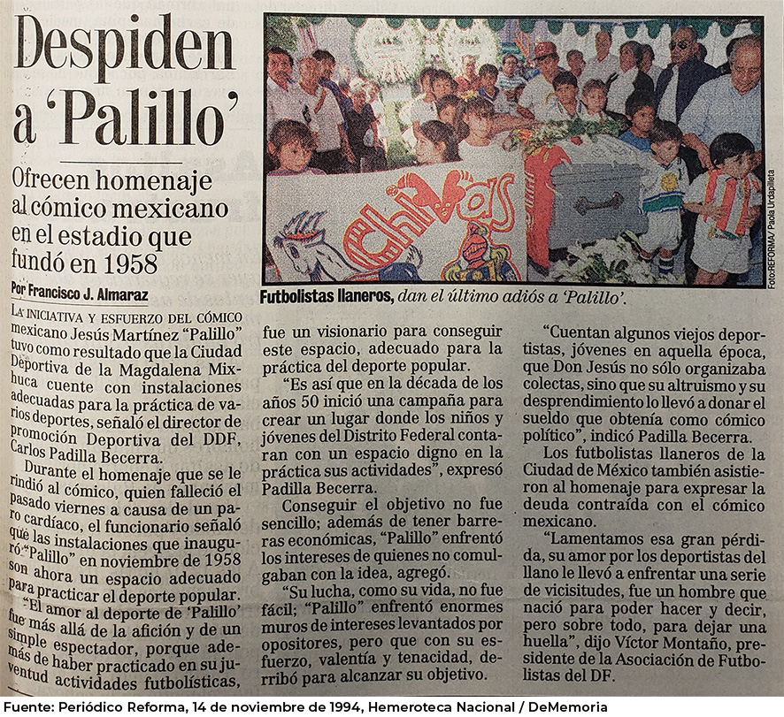 Se dice que una parte de lo que ganaba como comediante lo dedicó a las obras de la Ciudad Deportiva de la Magdalena Mixhuca y en homenaje, el estadio principal de la famosa deportiva le puso el nombre de Jesús Martínez ‘Palillo’.