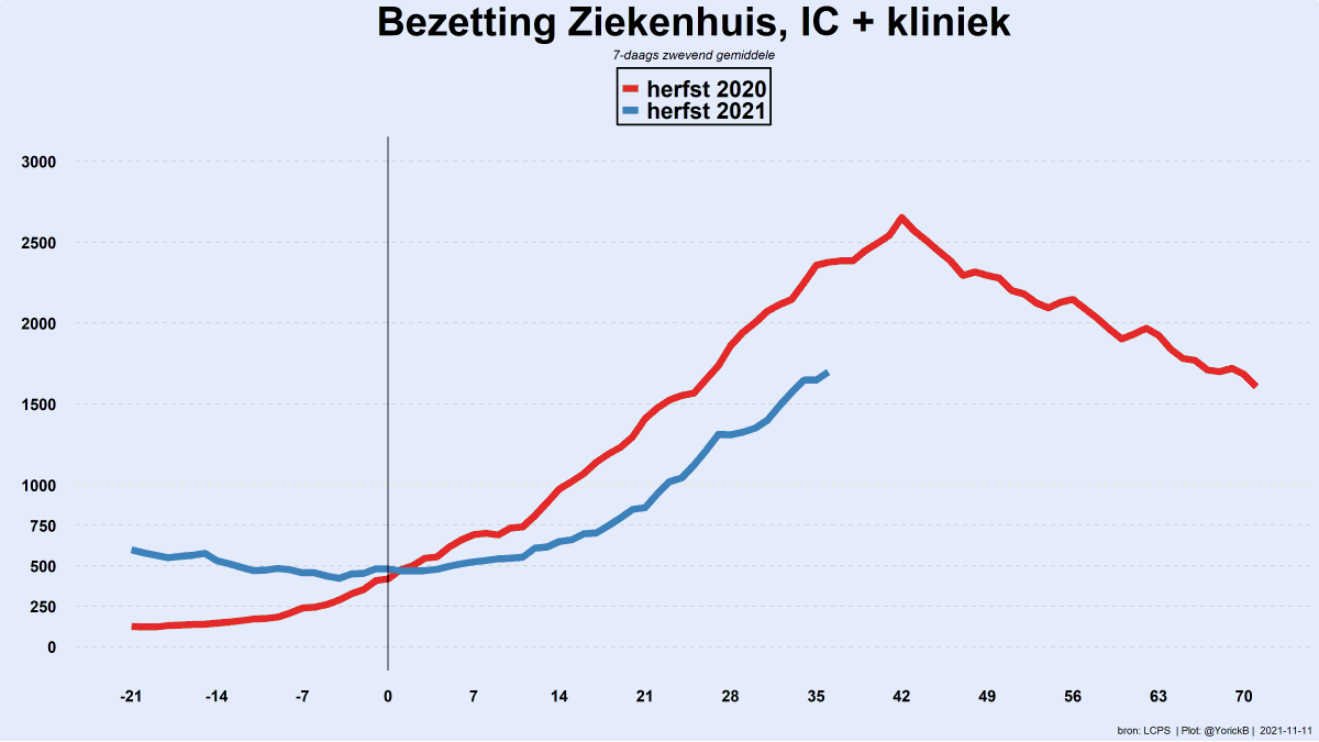 Als we de rode lijn volgen in de bezetting (rechts), dan gaat het daar nog gezellig druk worden met COVID-19 patienten.