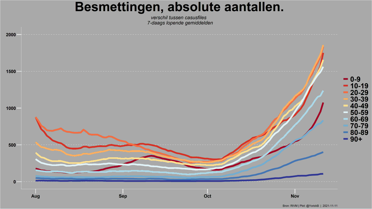 Aantal besmettingen binnen de leeftijdsgroepen.