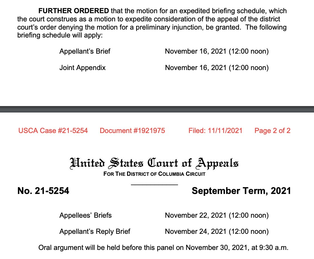 BREAKING: The DC Circuit Court of Appeals has granted a brief hold on the Trump executive privilege decision, setting a schedule that includes arguments on Nov. 30.
