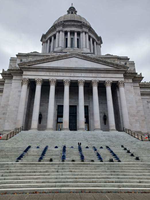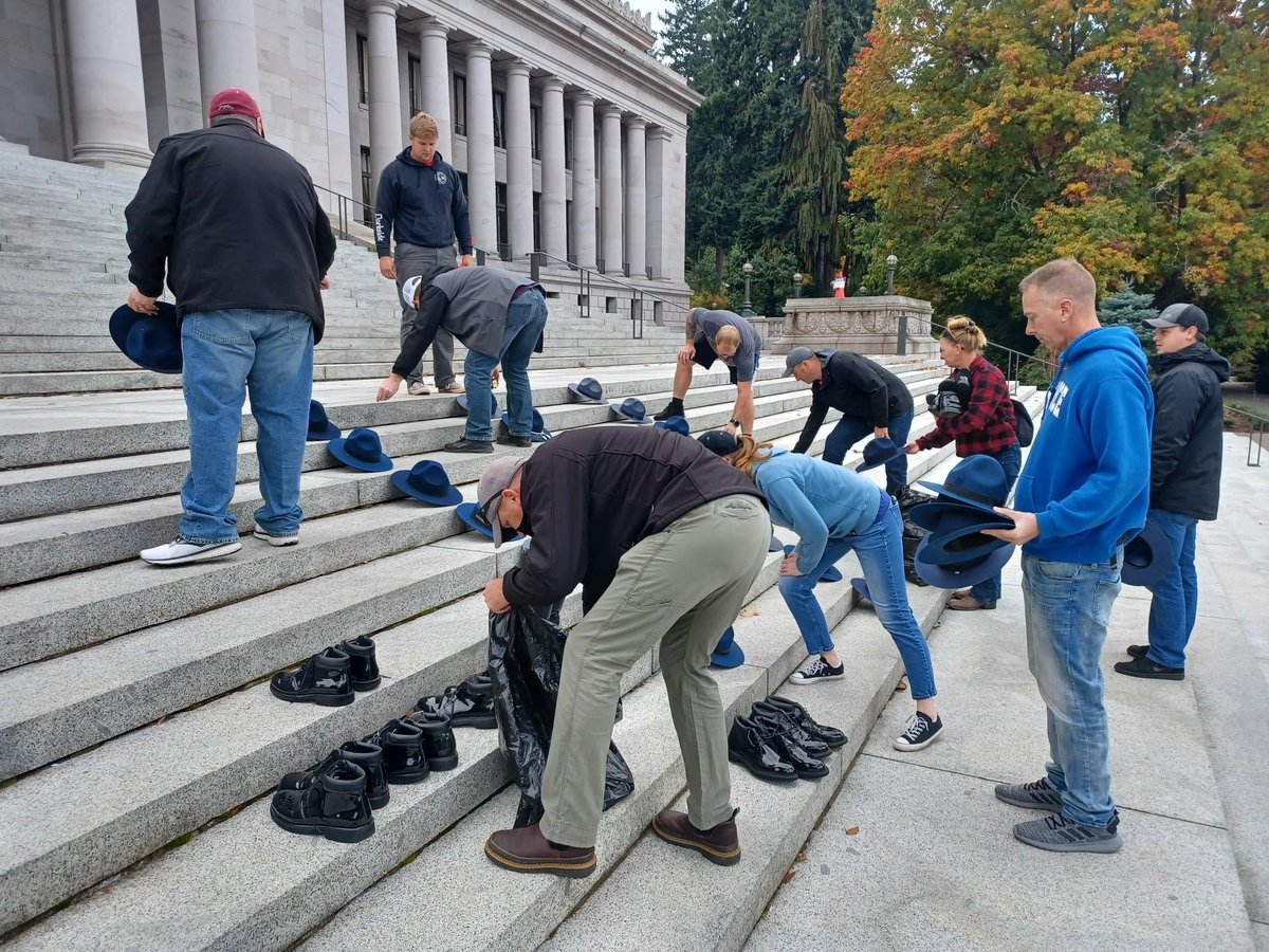 Membros da guarda estadual de Washington protestam no Capitólio pela perda de 127 empregos, de acordo com eles, de colegas que não quiseram se vacinar - representados pelos seus chapéus e botas