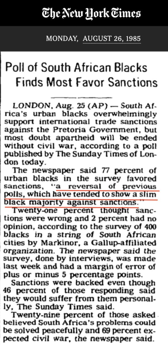 For yrs polls showed a majority of black South Africans opposed sanctions on South Africa. By the mid 80s this flipped and a majority supported them. But for over a decade the movement to sanction SA wasn’t supported by most black South Africans. Then they had their minds changed