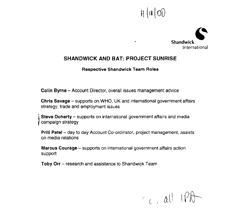 A memo from Shandwick to BAT in October 2000 set out roles on “Project Sunrise” & said that Patel was responsible for “day to day account co-ordination, project management” and “assists on media relations”.