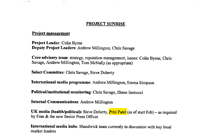 While documentation is carefully unclear about exactly what this project was, Priti Patel is named as as “day to day Account Co-ordinator, project management, assists on media relation & responsible for “UK media”, as part of Project Sunrise.