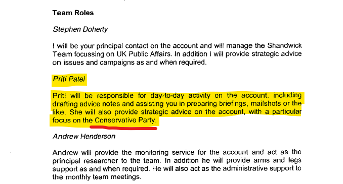 A letter from Weber Shandwick to BAT in January 2001 stated: “Priti will be responsible for day-to-day activity on the account... She will also provide strategic advice on the account, with a particular focus on the #Conservative Party.”