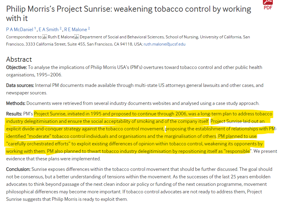 Philip Morris ran a "Project Sunrise" which “laid out an explicit divide-and-conquer strategy against the tobacco control movement”.