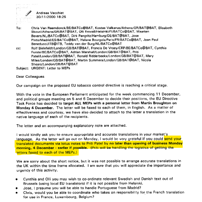 Patel was part of a group that sent a letter lobbying MEPs on the proposed EU’s Tobacco Control Directive. Documents suggest Patel was integral to BAT’s lobbying on the Directive: “Our campaign on the proposed EU tobacco control directive is reaching a critical stage”.