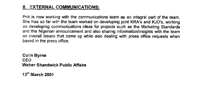 On 13 March 2001, Colin Byrne from Weber Shandwick wrote: “Priti is now working with the communications team as an integral part of the team … working on developing communications ideas for projects... and also sharing information/insights with the team on overall issues..."