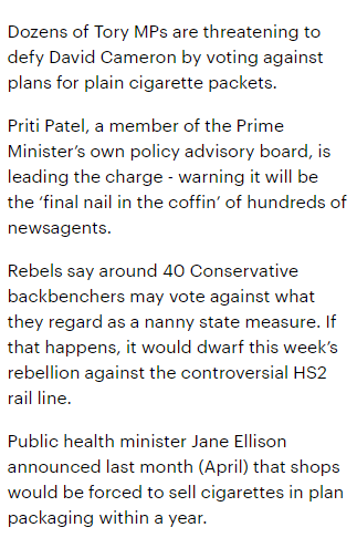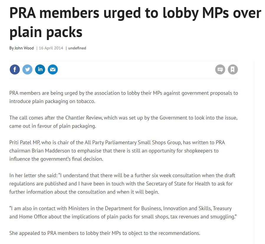 After the Chantler review into plain packaging was published, Patel wrote to the chair of the Petrol Retailers Association, appealing for its members to lobby their MPs to object as she was concerned about the implications of plain packs for small shops, tax revenues & smuggling.