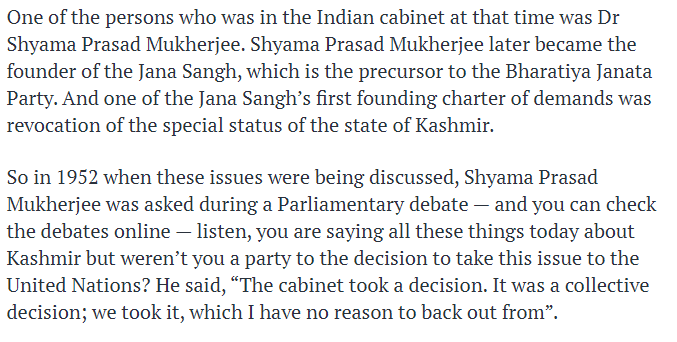 ऐसे एक नहीं अनेक उदाहरण है जो साबित करते है काश्मीर में जो फैसले आजादी के बाद लिए गए, उनमे पंडित नेहरु अकेले नहीं, बल्कि उनका पूरा मंत्रिमंडल शामिल था, और उस मंत्रिमंडल में एक प्रमुख नाम था भाजपा के पितृपुरुष डॉक्टर श्यामाप्रसाद मुखर्जी का. #NehruAndKashmir 5/n