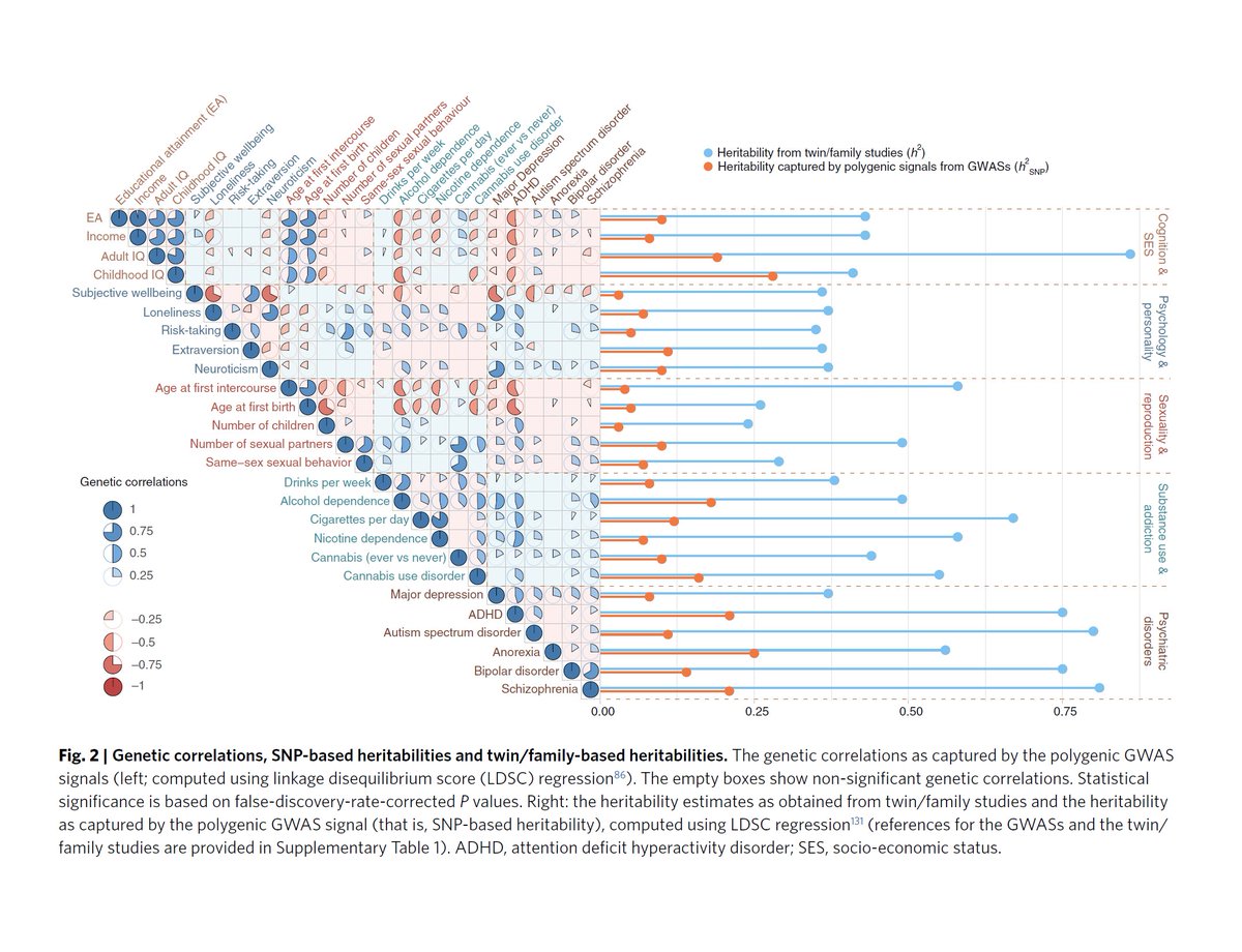 2| Die blauen Linien in der Grafik (Q1) stehen für die Erblichkeitsschätzungen einzelner Merkmale aus Zwillingsstudien. Orange steht für die Erblichkeit, die wir mit heutigem Wissen aus Genanalysen auf Bevölkerungsebene mit teils Millionen von Probanden (GWAS) errechnen können.