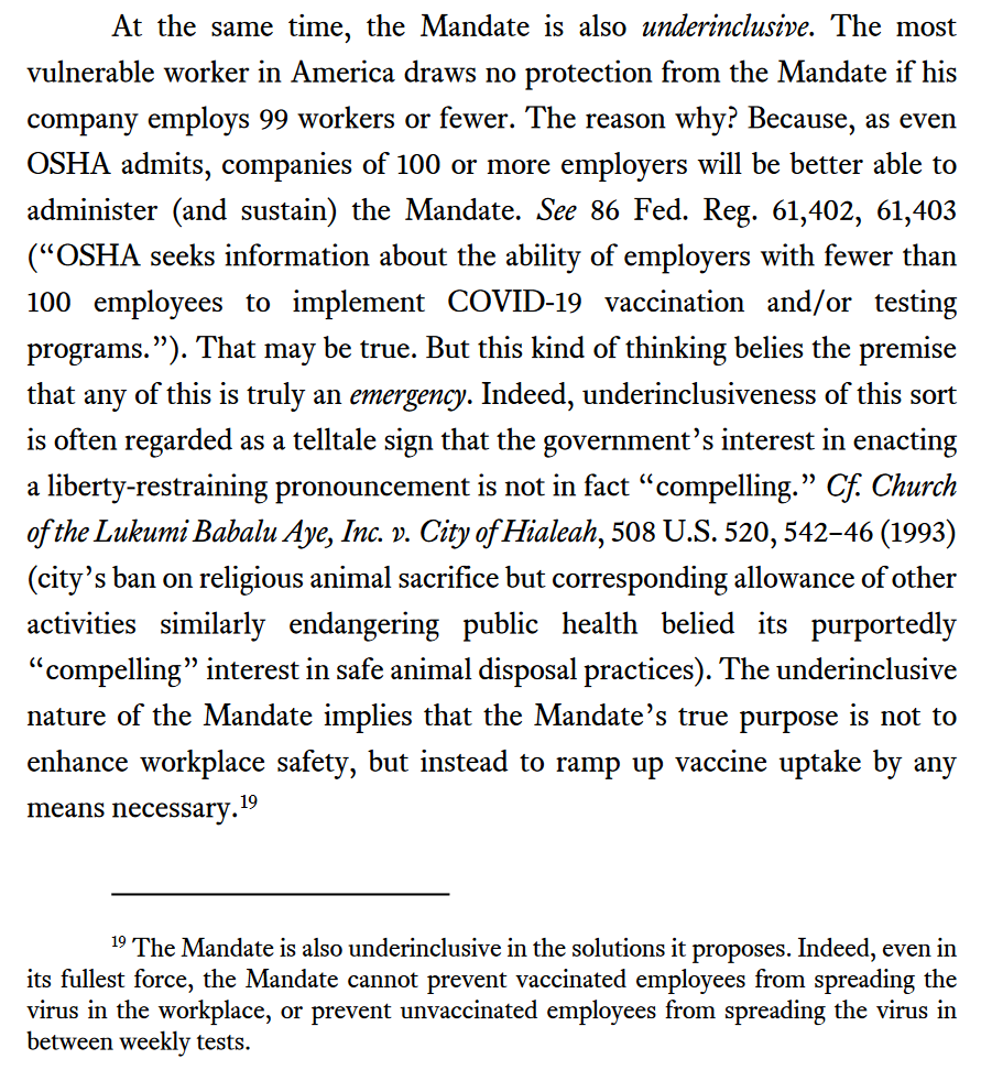 "The underinclusive nature of the Mandate implies that the Mandate’s true purpose is not to enhance workplace safety, but instead to ramp up vaccine uptake by any means necessary."